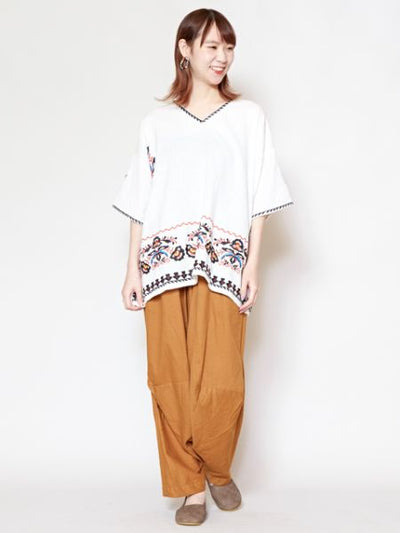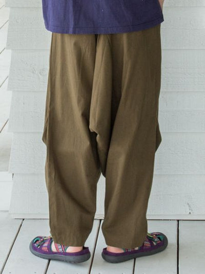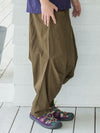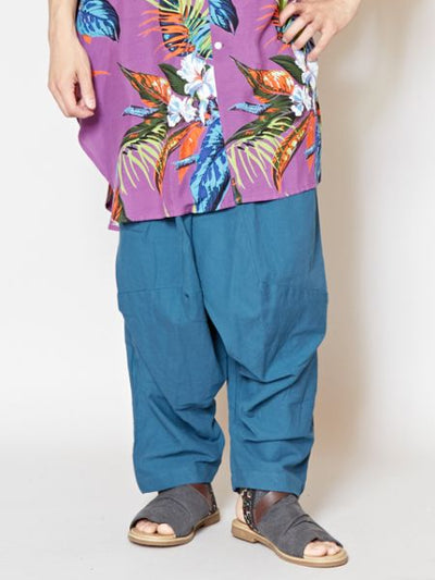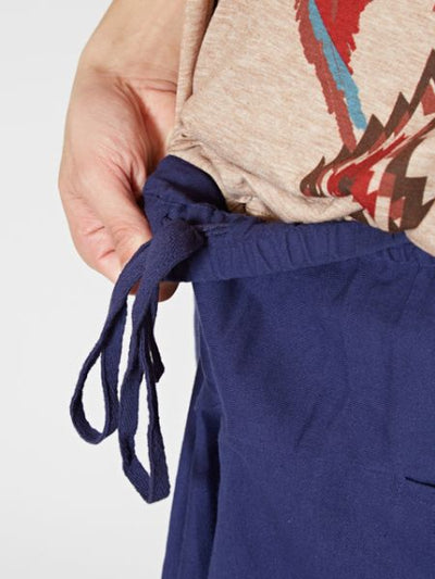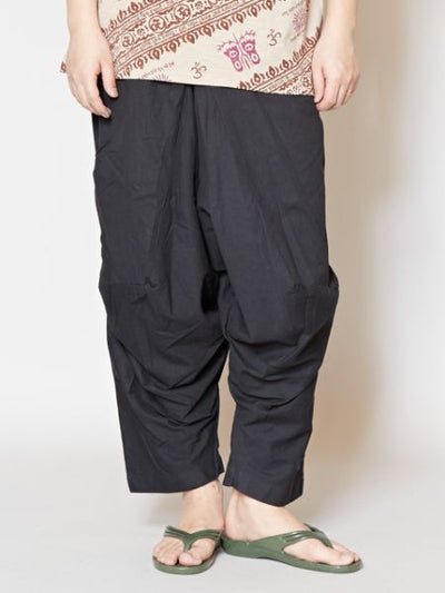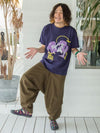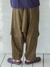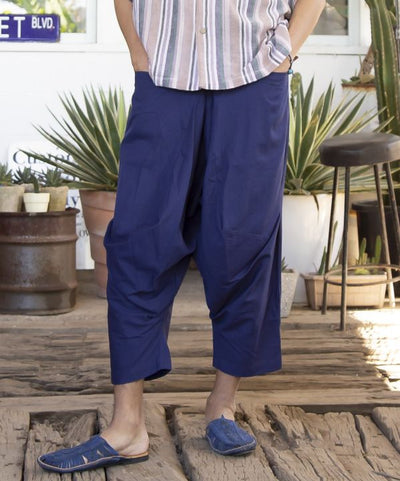 The three-dimensional silhouette of these transformable sarouel pants is unique. The more you wear them the more comfortable the rustic Indian cotton material becomes. Two pockets on the front. Size can be adjusted with elastic waistband and ties.