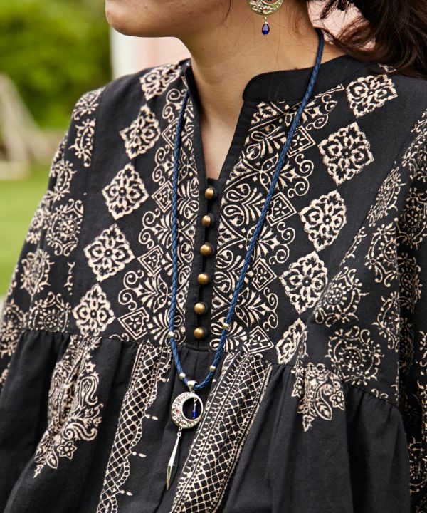 This necklace is engraved with a moon motif, which means protection against evil, in the design of the Kilim pattern, which is believed to wish good news to travelers and protect them on their journeys. The swinging design is also a key point to make your chest shine.