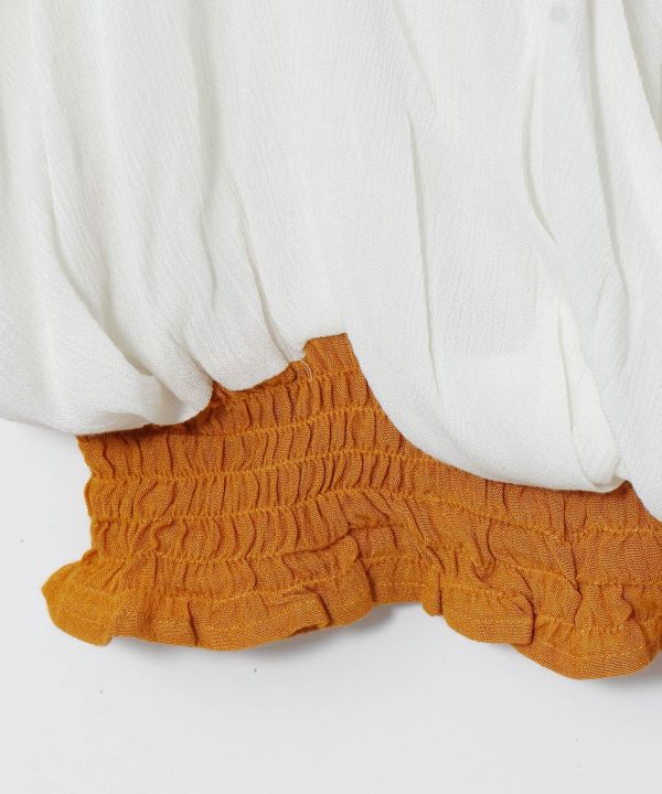 The light rayon crepe material is light and comfortable to wear. The color scheme of the shirred hem and the ribbon at the back of the body are key points. It can be worn as a single piece for a stylish look.