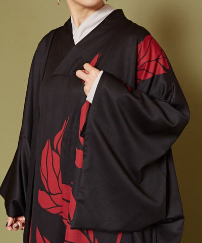 This kimono-like haori has a bold design with a single flower motif. The design is simple yet impactful and we recommend wearing it as a set-up with a dress from the same series. The wrinkle-resistant material and loose silhouette make it comfortable to wear, and the kimono-like sleeves allow you to easily incorporate Japanese elements. With side pockets on both sides.