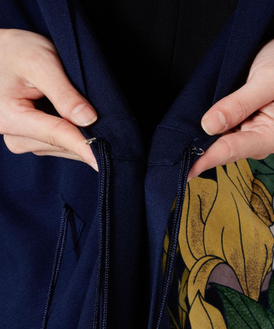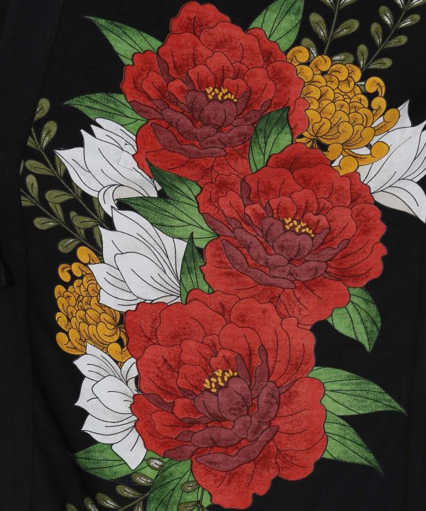 This short-length haori is boldly decorated with various kinds of flowers such as chrysanthemums and peonies. The square shape of the haori makes it easy to wear and it fully covers the buttocks. The rayon material is light and comfortable to wear, and has a UV protection finish.