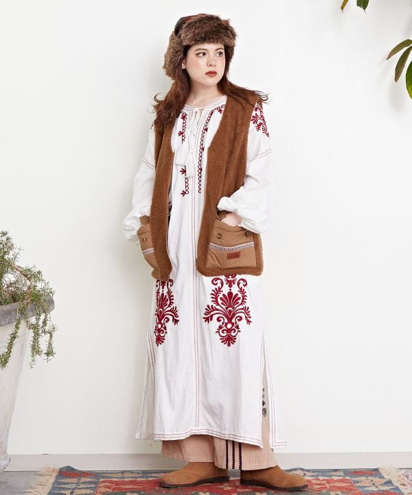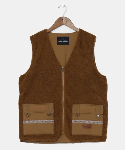 Amina x grn collaboration project. A vest made of boa material with a shiny nylon quilt design. The large pockets are easy to use. Despite the loose silhouette the material is lightweight, making it easy to use as a light outerwear for long seasons.