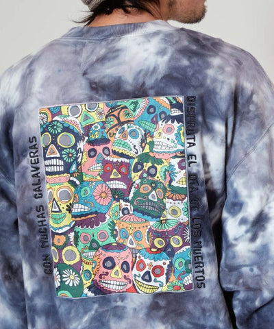 Amina x grn collaboration project. This top has a Mexican "Day of the Dead" theme. The impressive tie-dye print on the back is decorated with a large number of calaveras. Firmly lined material. A versatile piece.