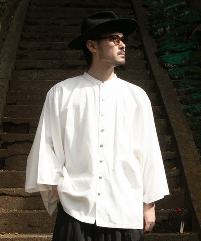 Shosei-style shirt with a Taisho modern atmosphere. This chic design incorporates the "kakusode" design seen in men's kimonos. One-pointed pattern embroidery is applied to the back of the neck. (Black: Sumi-mon 炭紋、White: Hasu-mon 蓮紋、Red: Tsubaki-mon 椿紋)
