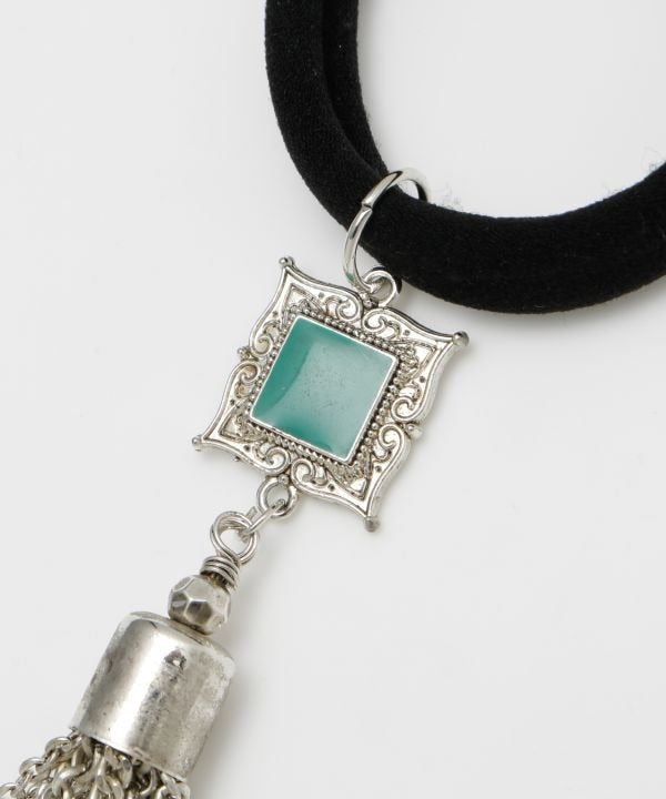 Inspired by the ornaments worn by nomads the extravagant charms on this hair elastic are eye-catching. The thick elastic part makes it easy to arrange your hair without leaving marks. The shimmering decoration is a perfect match for updo styles.