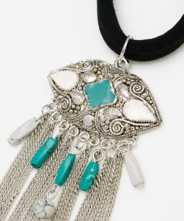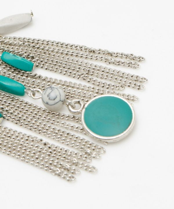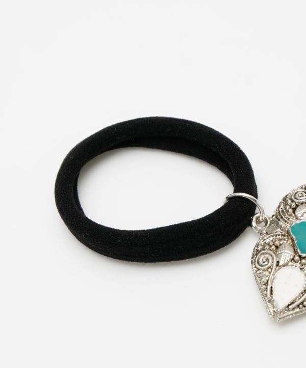 Inspired by the ornaments worn by nomads the extravagant charms on this hair elastic are eye-catching. The thick elastic part makes it easy to arrange your hair without leaving marks. The shimmering decoration is a perfect match for updo styles.