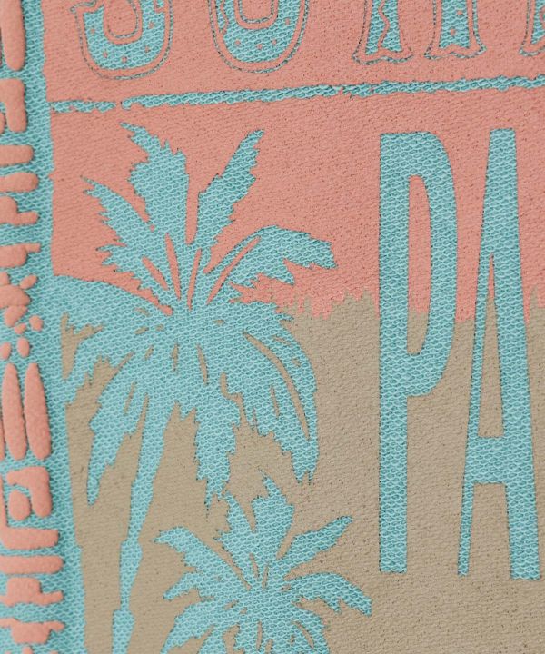 This men's top has a textured look and feel, and is made of a backed fabric. It features a vintage-style design of Hawaiian scenery and a partially pockmarked fumed print. The lightweight material can be worn in any season.