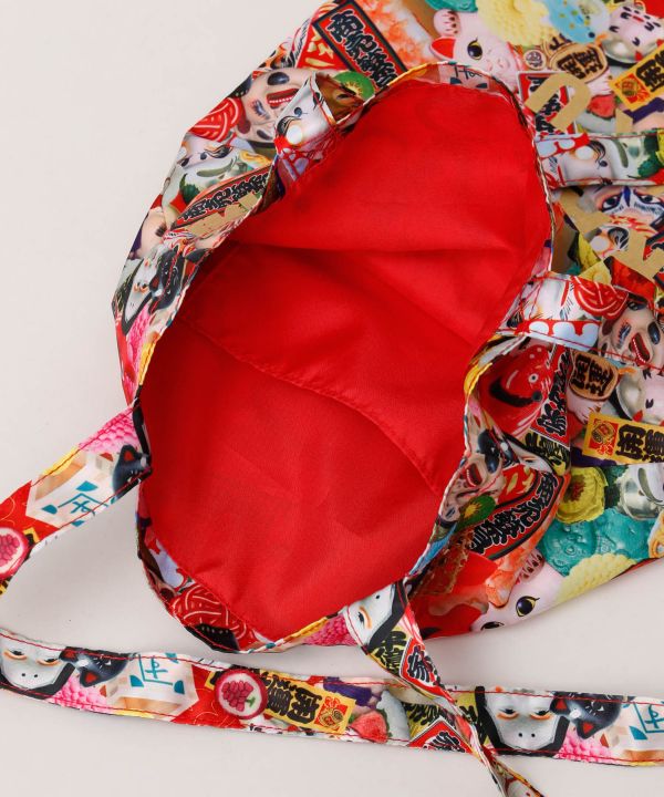 A lively "開運来福 - Kaiun Raifuku" tote bag filled with Japanese lucky charms and celebratory items. The A3 size is easy to use. With its high-impact design it is recommended for everyday use as well as for souvenirs and gifts. With one inside pocket.,