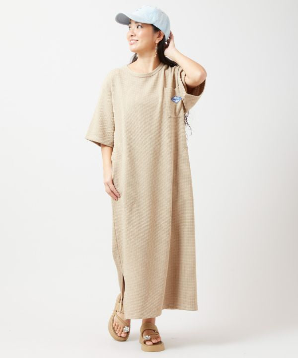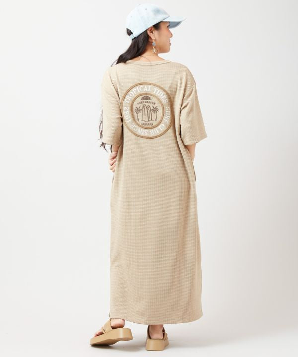This dress features a striking design combining machine embroidery and cord embroidery. Embroidered patches add accent details while the waffle fabric offers a smooth, comfortable feel against the skin. It's a casual yet elegant piece.