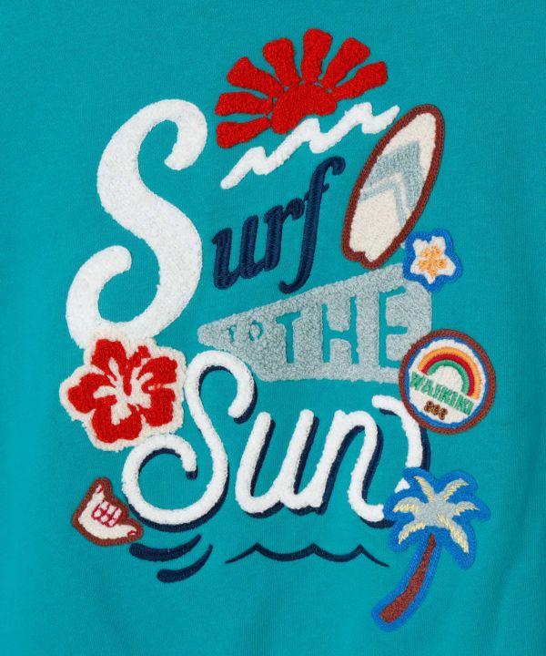 This hooded top features a striking design combining Sagara embroidery with machine embroidery. Its cropped silhouette creates a balanced look while the soft, brushed fabric offers a gentle feel against the skin. It's a casual piece with a touch of Hawaiian-inspired brightness.