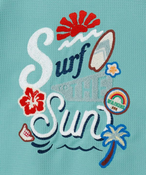 This T-shirt features a playful design combining Sagara embroidery with machine embroidery. Crafted from waffle-textured fabric, it offers excellent breathability and a lightweight feel. Its cropped silhouette delivers a trendy style.