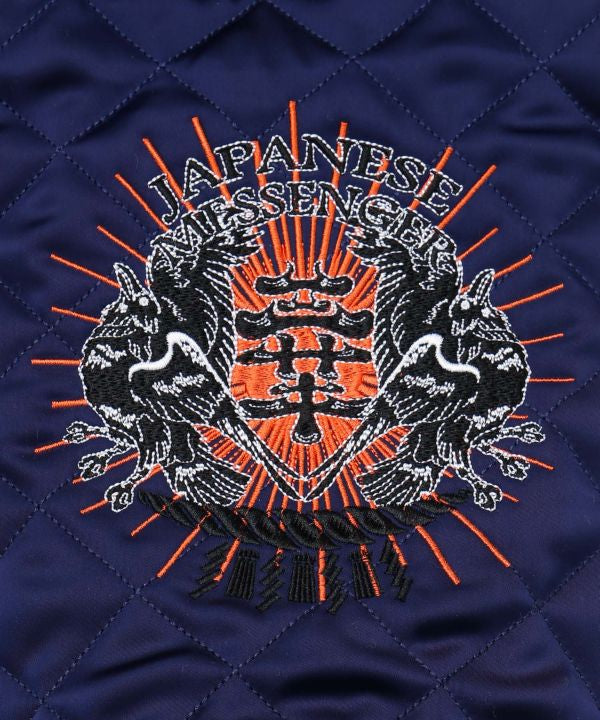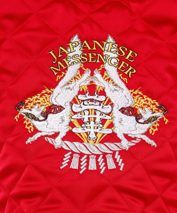 Quilted fabric x embroidered shoulder bag. Featuring bold embroidery depicting foxes, crows, and rabbits—the divine messengers known as "Shinji." Includes a detachable shoulder strap, allowing it to be used as a handheld bag. Perfect for quick outings or as a side bag, it easily holds your smartphone, wallet, and water bottle.