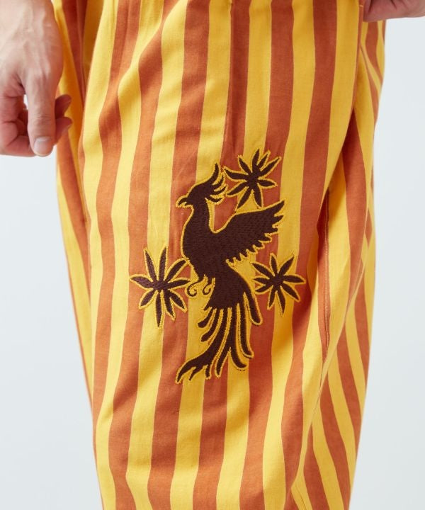 These tapered pants are inspired by Mexico’s colorful culture, featuring umbrella-sky stripe tones and Otomi embroidery motifs. Made from breathable Indian cotton, they offer relaxed comfort with artistic ethnic flair.