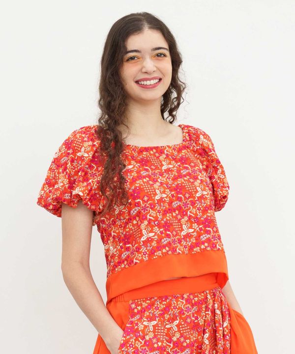 A top featuring luxurious embroidery reminiscent of sari and chiffon fabric. Its silhouette evokes the traditional Indian garment the choli. The open back and voluminous sleeves add a touch of glamour.
