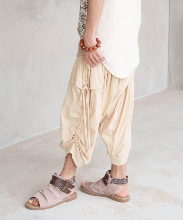 Men’s harem pants made from stretch cut-and-sew fabric for comfort and flexibility. The adjustable side strings allow for silhouette variation, while a pen pocket adds functionality. A relaxed yet distinctive piece that supports individual, creative styling.