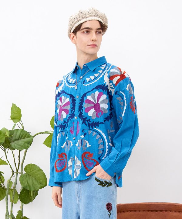 A men's shirt featuring the traditional Kazakh embroidery motif "Suzani." The large embroidery on the back makes a striking impression, authentically recreating the local atmosphere. This piece highlights the beauty of the embroidery, making it the focal point of any outfit.