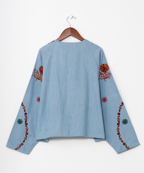 A lightweight denim shirt featuring eye-catching floral embroidery. Crafted with a no-collar design and gusseted pockets for an oversized silhouette. A piece infused with hippie philosophy.