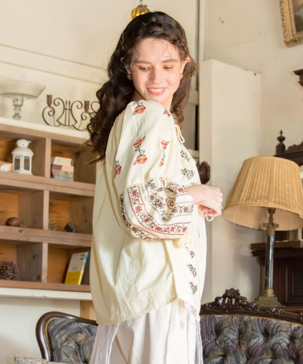 A classic blouse featuring Ukrainian embroidery motifs including the Vyshyvanka. Richly embroidered with meaningful symbols like poppy seeds, traditionally regarded as a talisman against evil. Gathered detailing around the collar adds a touch of elegance, creating a piece that retains elements of traditional folk costume while offering a light, easy-to-wear silhouette.